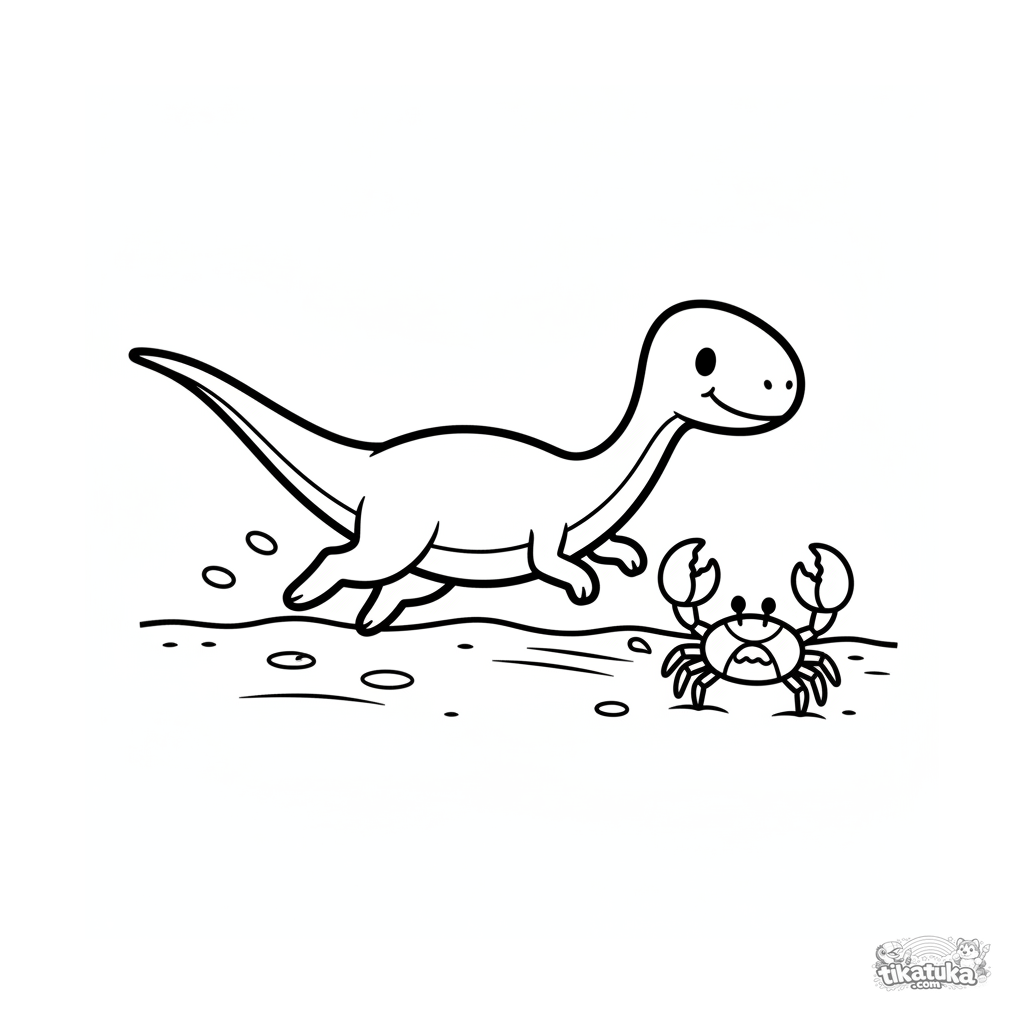 Página simple para colorear para niños pequeños 2-3 años: un pequeño dinosaurio compsognathus corriendo tras un cangrejo en la arena de una playa antigua.