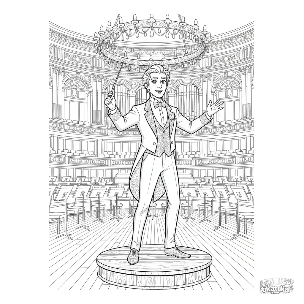 Página para colorear para niños mayores de 10-12 años: un director de orquesta con esmoquin dirige apasionadamente desde el pódio en un escenario.