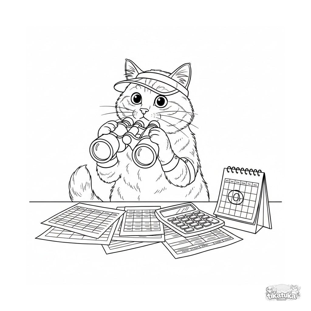 Página para colorear para niños 10-12: un gato contable confundido en un escritorio desordenado mira por el extremo equivocado de unos prismáticos. Meme detallado sobre vida de oficina y salario.