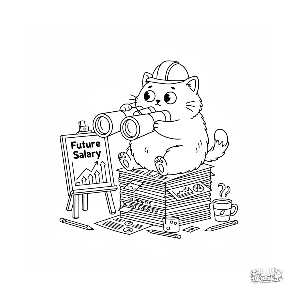 Página para colorear detallada para niños de 10-12 años: un gato confundido con casco de construcción intenta ver su salario con prismáticos gigantes. Escena de meme absurda.