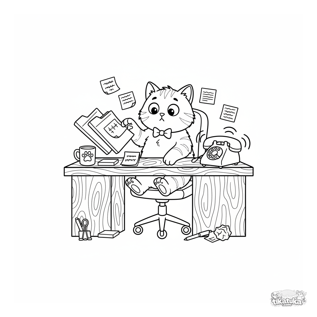 Página para colorear para niños 7-12: un gato confundido con corbata sentado en una silla de oficina mirando carpetas apiladas y un teléfono sonando. Divertida escena de caos laboral.