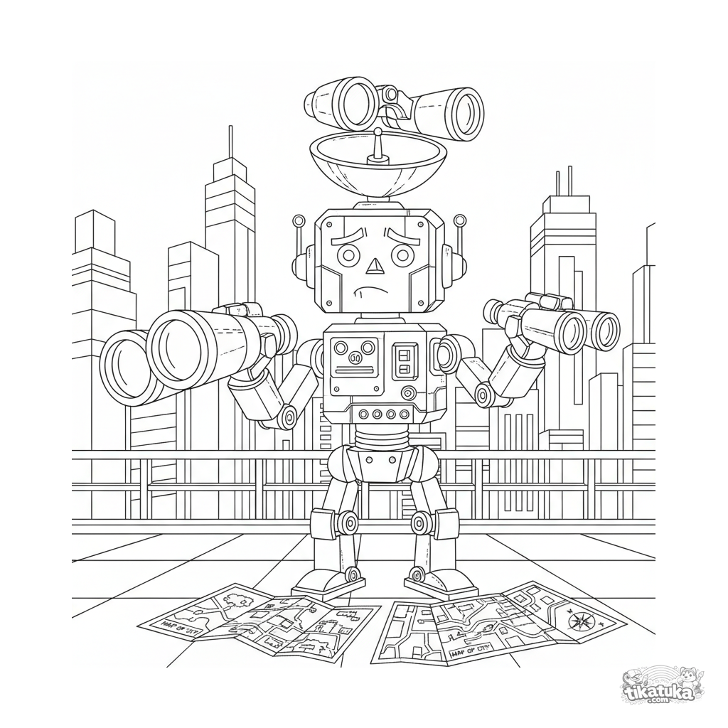 Página para colorear para niños 10-12: un robot confundido en una plataforma de observación intenta usar tres binoculares a la vez, buscando su pago. Meme técnico con detalles.