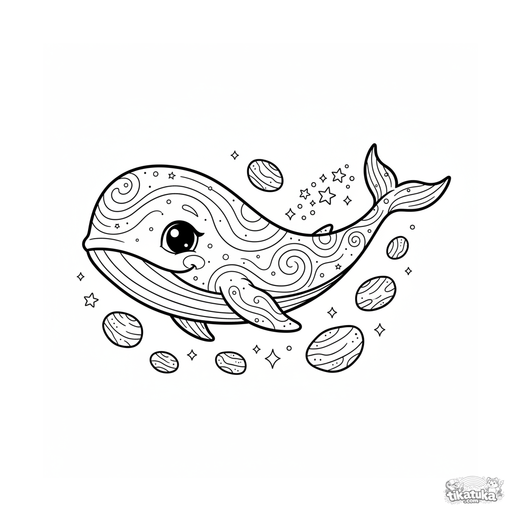 Página para colorear para 7-9 años: una majestuosa ballena cósmica con piel de nebulosa navega por un cinturón de asteroides entre estrellas. Líneas fluidas.