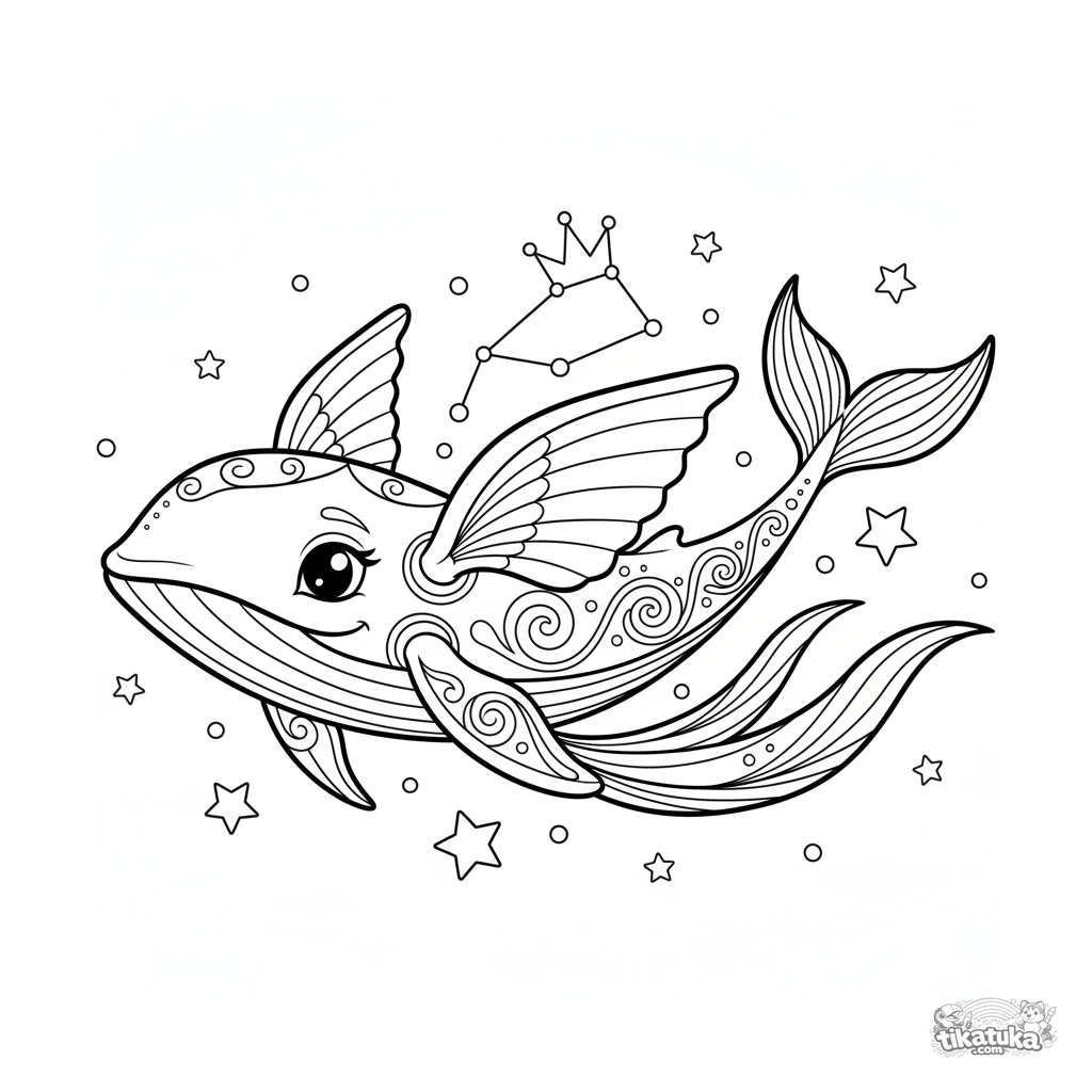 Página para colorear detallada para 10-12 años: una majestuosa ballena cósmica con patrones corporales nada por un campo estelar y una constelación. Líneas fluidas y artísticas.
