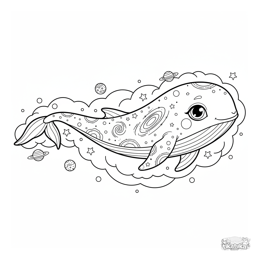 Página para colorear para 7-9 años: una ballena cósmica con patrones de galaxias nada a través de una nebulosa estrellada. Líneas elegantes para colorear.