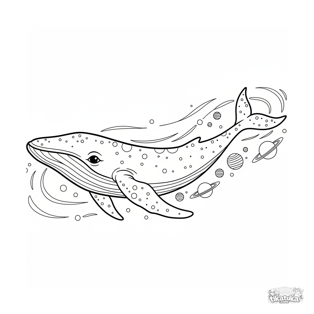 Página para colorear detallada para niños mayores 10-12: una ballena cósmica realista nada a través de los contornos de una nebulosa estelar en el espacio exterior. Trabajo de líneas intrincado.