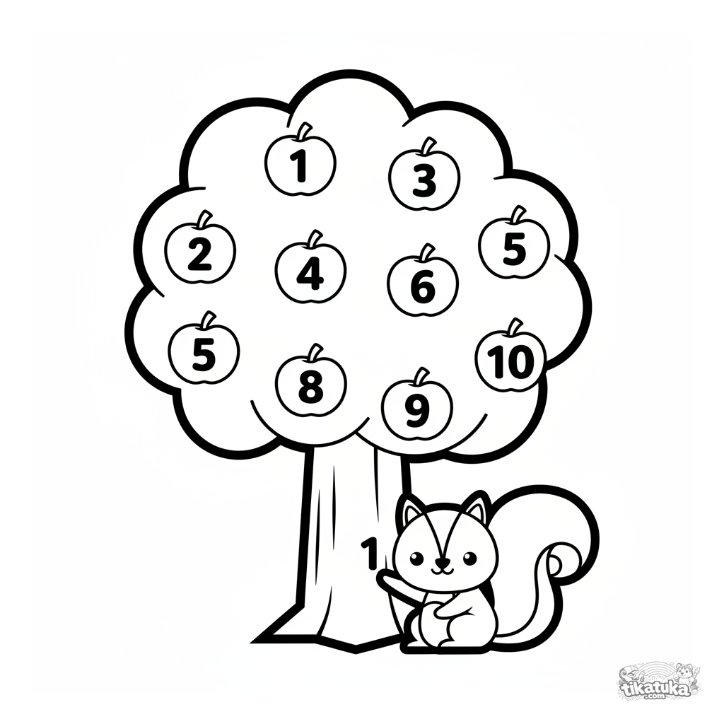Página educativa para colorear para niños pequeños: cuenta manzanas del 1 al 10 en un árbol con una ardilla. Formas simples.