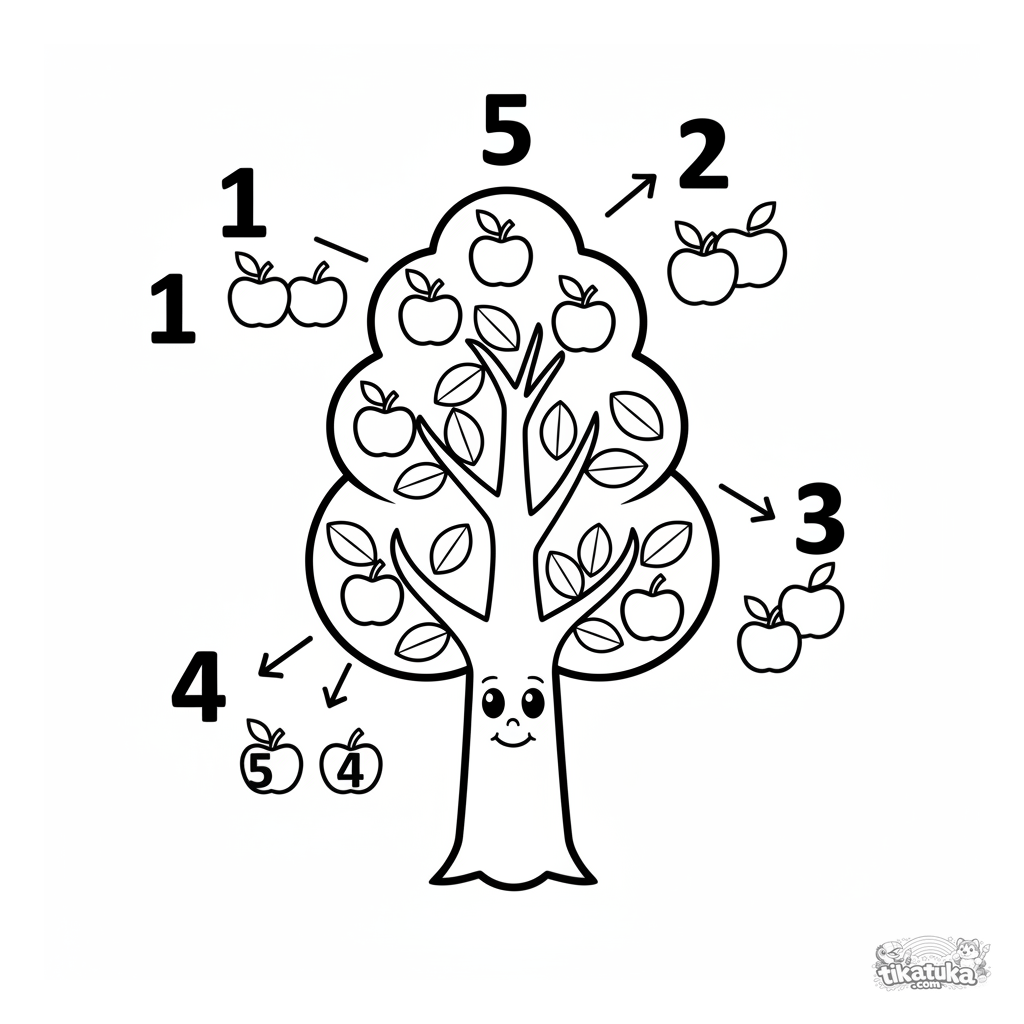 Página para colorear educativa para niños pequeños de 2-3 años. Un manzano con manzanas y números del 1 al 5 ayuda a aprender a contar. Formas simples.