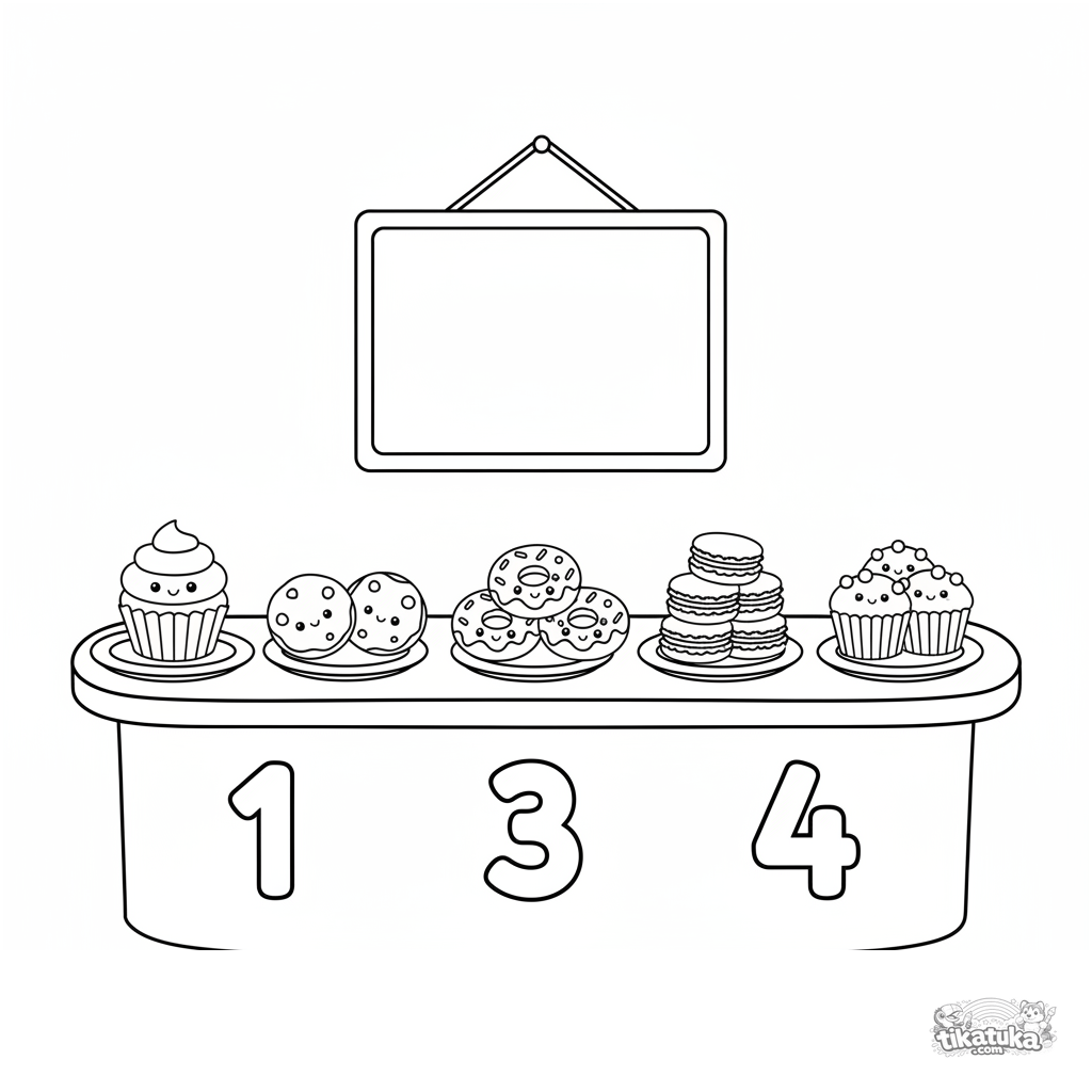 Página para colorear educativa para niños 2-4: cuenta del uno al cinco con caras alegres de pasteles en un mostrador de pastelería. Perfecto para primeras lecciones de matemáticas.