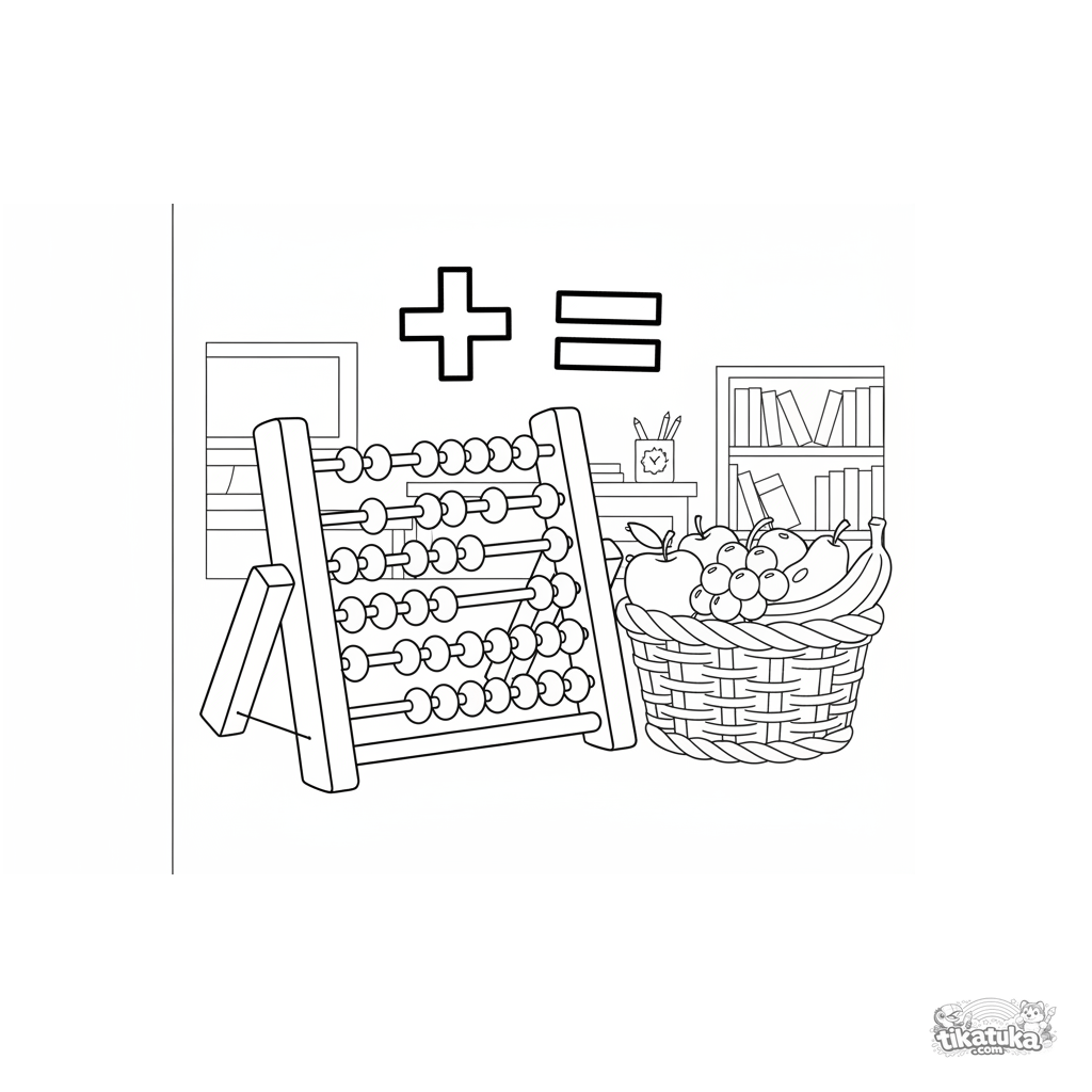 Página educativa para colorear para niños 4-6 años: contar frutas con un ábaco de madera. Composición simple y clara para aprender a contar.