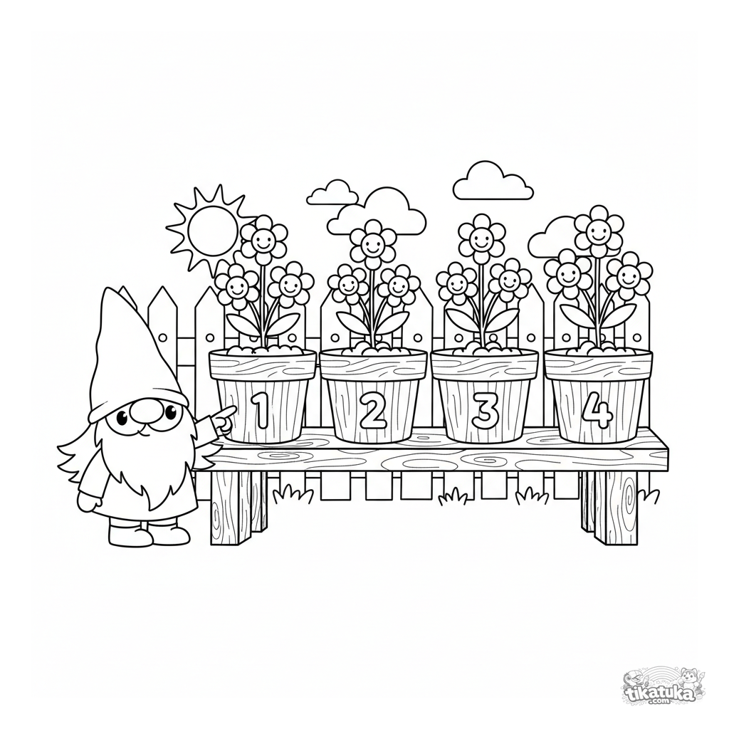 Página para colorear educativa para niños 4-6 años: aprende a contar del 1 al 5 con macetas numeradas y un gnomo de jardín amigable.