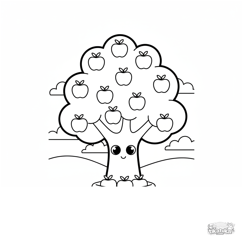 Página educativa para colorear para niños 4-6: un manzano con diez manzanas y una cesta con tres más en la base ayuda a practicar el conteo.