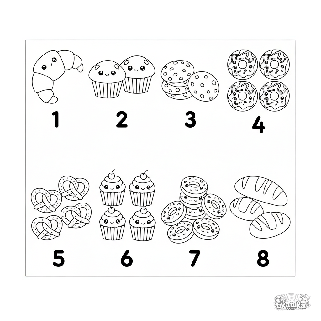 Página para colorear educativa tipo hoja de pegatinas para niños pequeños de 2-3 años: cuenta del 1 al 8 diferentes productos de panadería. Formas simples, números claros, ideal para primeras lecciones de contar.