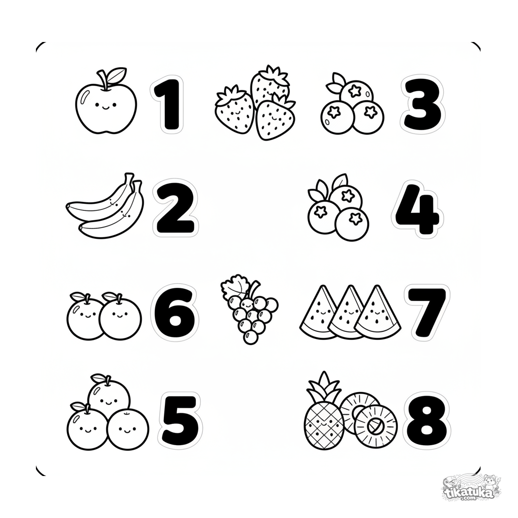 Página educativa tipo hoja de pegatinas para colorear para bebés 2-3: grupos simples de frutas y números grandes para aprender a contar del uno al ocho.