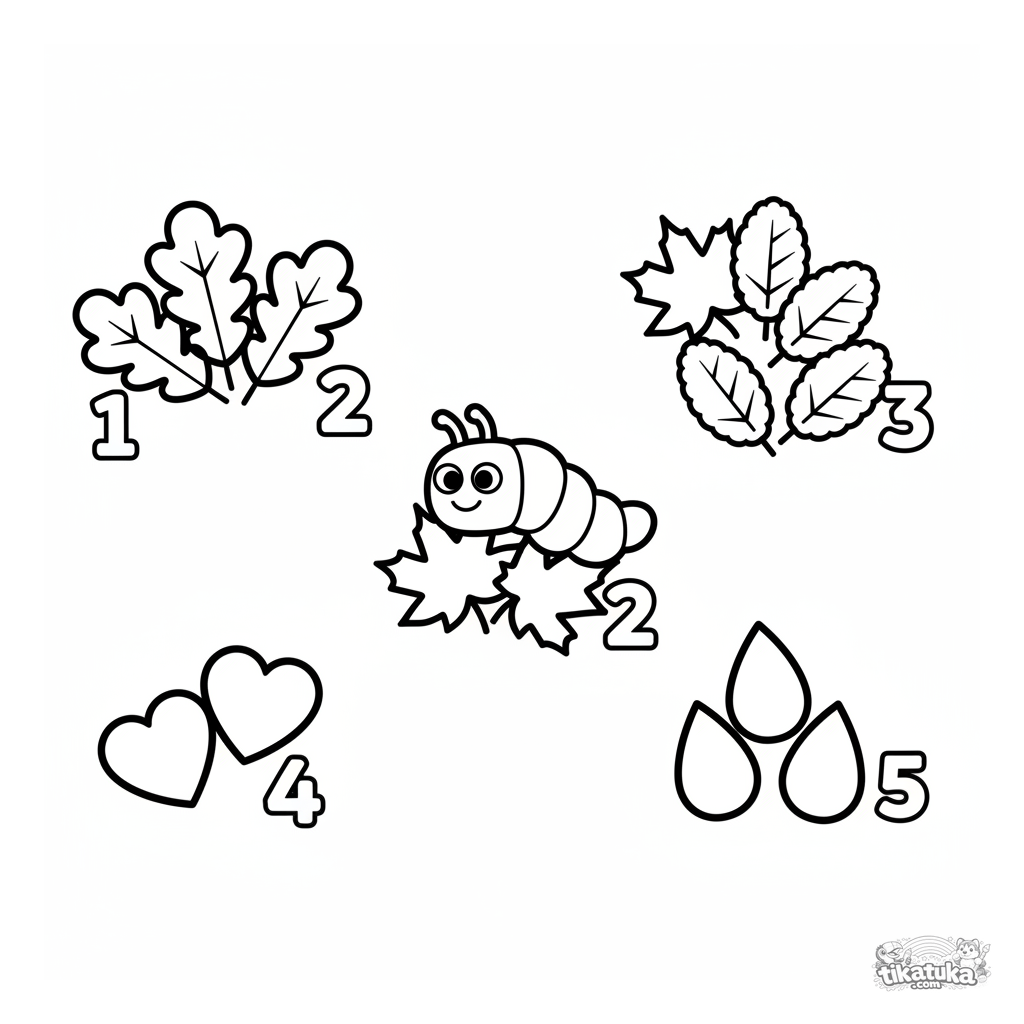 Página para colorear educativa para niños de 4-6 años: cuenta grupos de hojas de diferentes formas (roble, arce, abedul) con números del 1 al 5 y una oruga amigable.