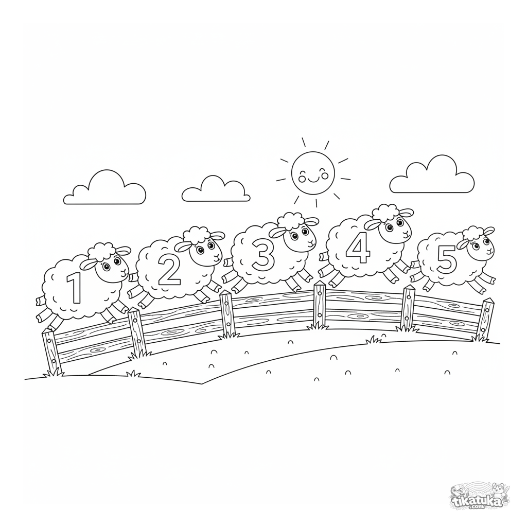 Página para colorear educativa para niños 4-6: cinco ovejas esponjosas con números saltan una valla. Ayuda a aprender la secuencia numérica del 1 al 5.