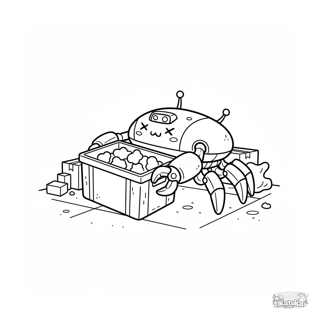 Página para colorear de un robot cargador tipo cangrejo levantando un cajón en un almacén. Para niños de 7 a 9 años.