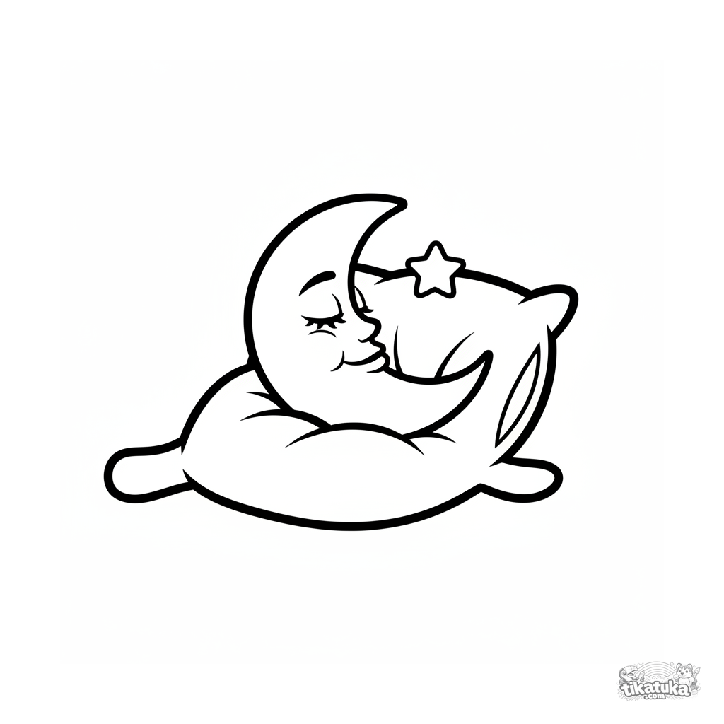 Página para colorear para niños pequeños: una luna creciente mecida duerme profundamente en un cojín suave. Líneas curvas suaves y un tema tranquilo son adecuados para colorear antes de dormir.