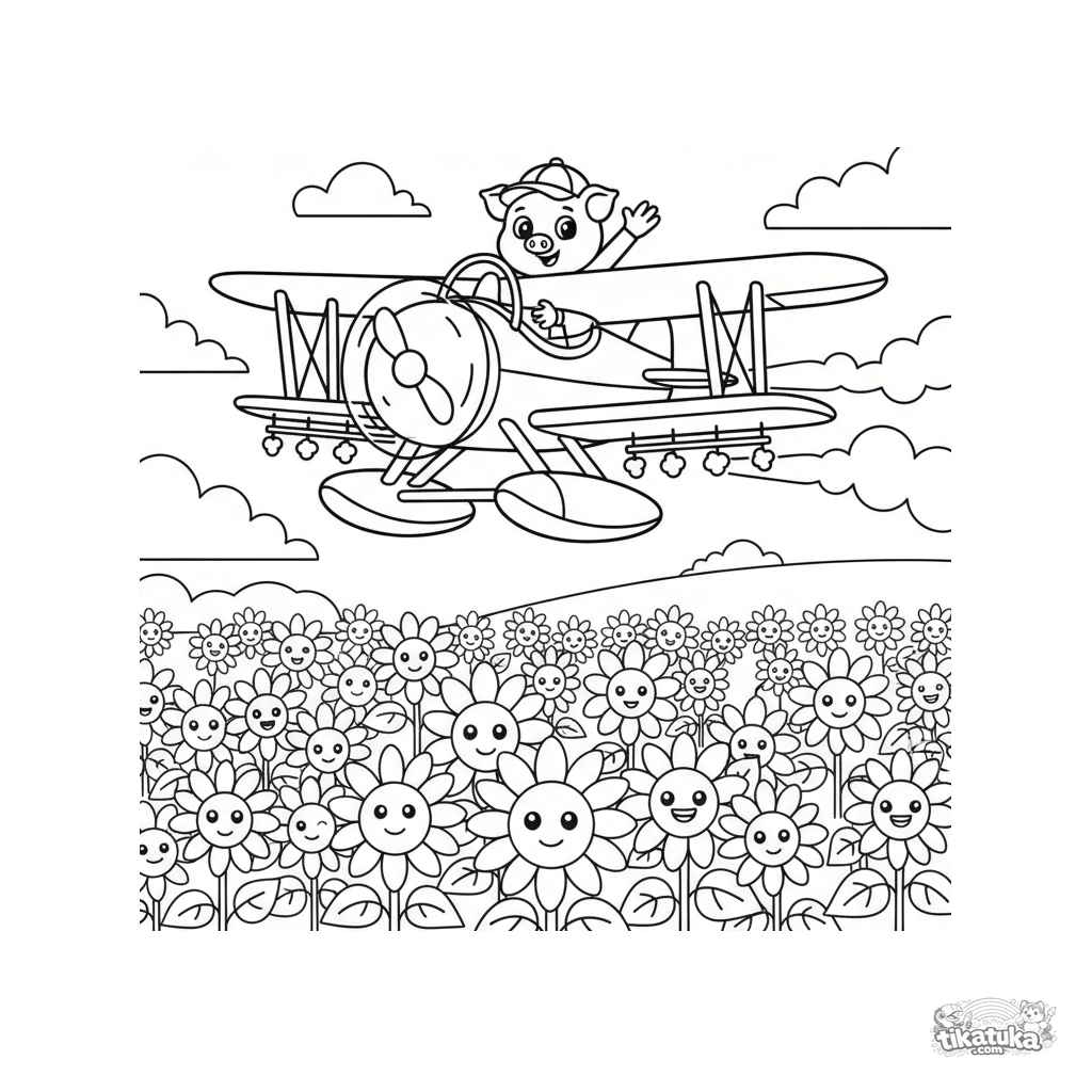Página simple para colorear para toddlers: un biplano agrícola vuela sobre un campo de girasoles. Formas grandes, piloto cerdo saludando. Para 2-3 años.