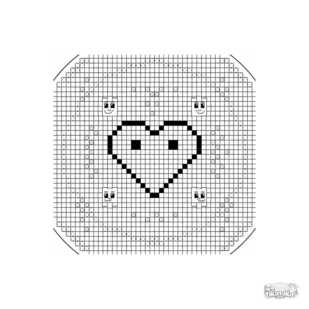 Página para colorear de mandala de punto de cruz pixelado única para niños de 10-12 años. Centro de corazón, anillos de flores y patrones pixelados. Actividad de colorear en cuadrícula.