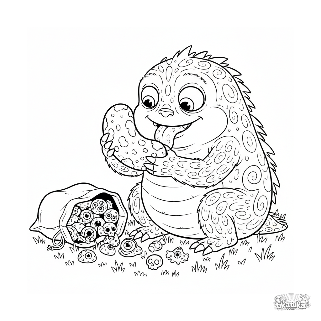 Página compleja para colorear para niños 10-12: un monstruo bajo con cuatro brazos examina una golosina gigante en la hierba. Escena detallada con textura.