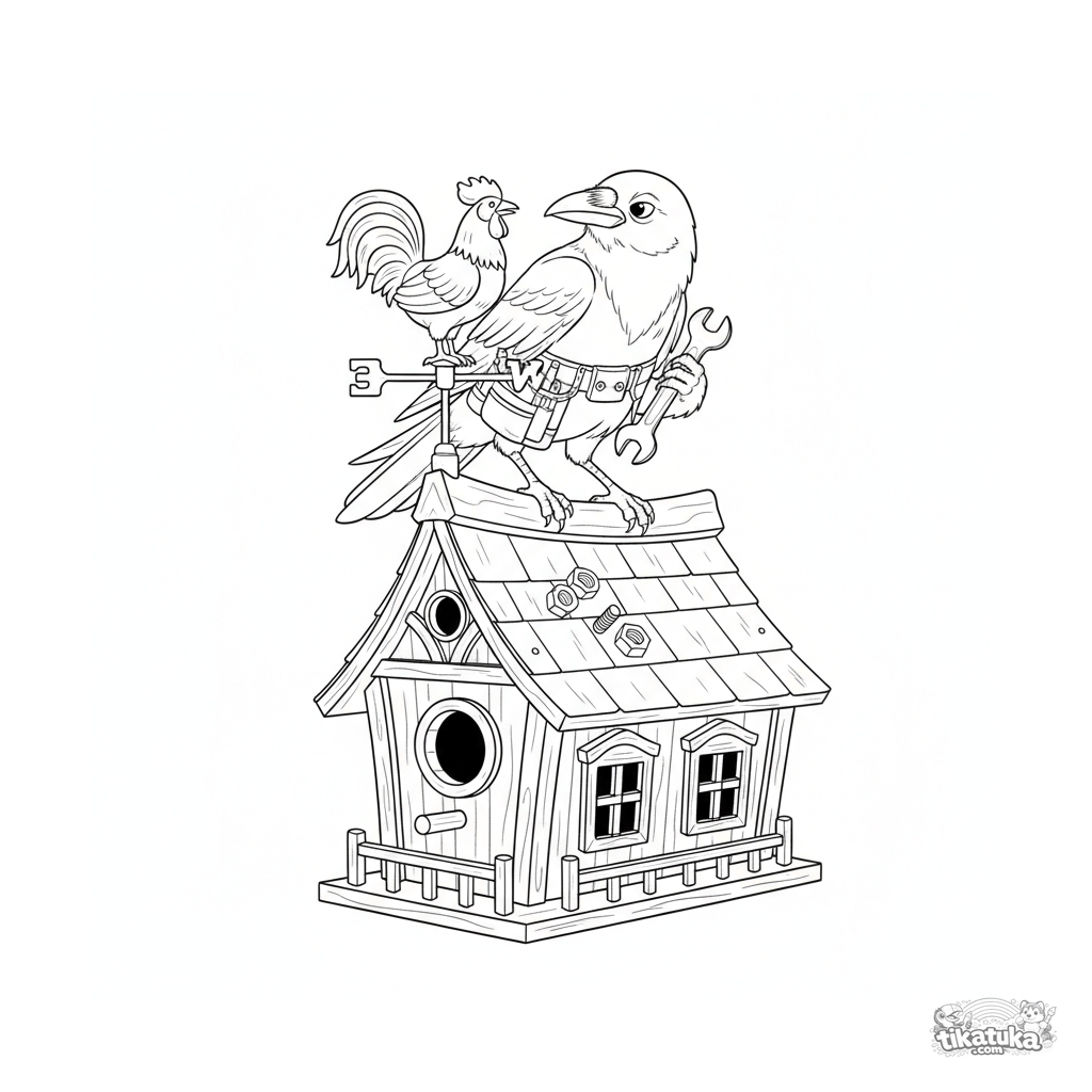 Página compleja para colorear para niños mayores 10-12: un cuervo listo con cinturón de herramientas repara una veleta en el techo de una casa de pájaros detallada.