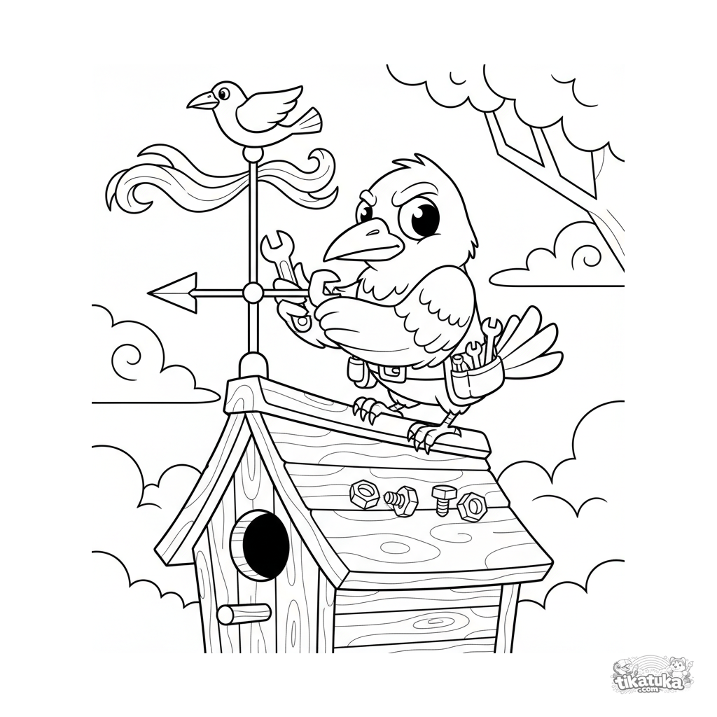 Página para colorear para 10-12 años: un astuto cuervo mecánico repara una veleta en una caja nido. Escena detallada en estilo cartoon de los 90 con herramientas.