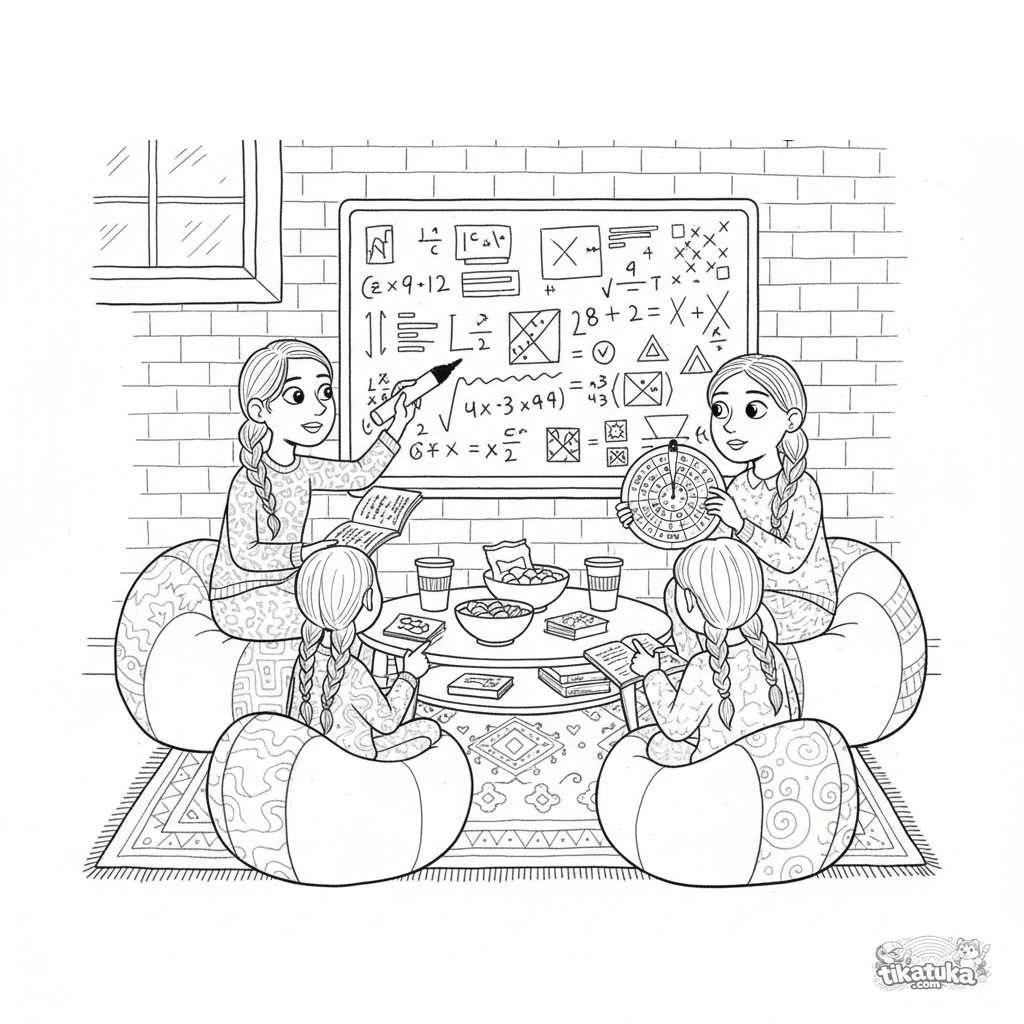 Página para colorear para niños de 10-12 años: miembros de un club de criptografía descifran códigos complejos durante una reunión en un sótano. Escena detallada en estilo boceto acuarela.