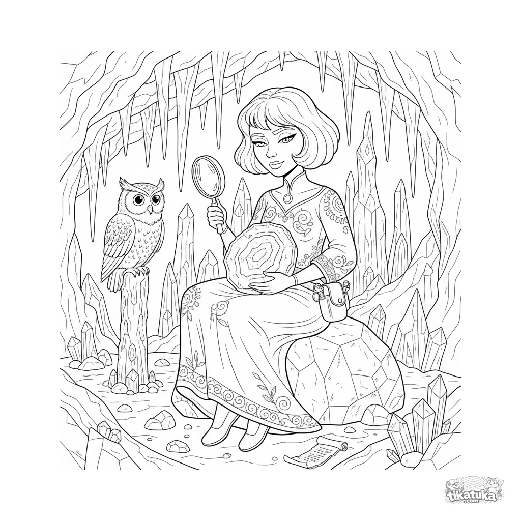 Página para colorear para niños mayores 10-12: una princesa estudiosa examina un geoda brillante dentro de una cueva de cristal, con un búho.