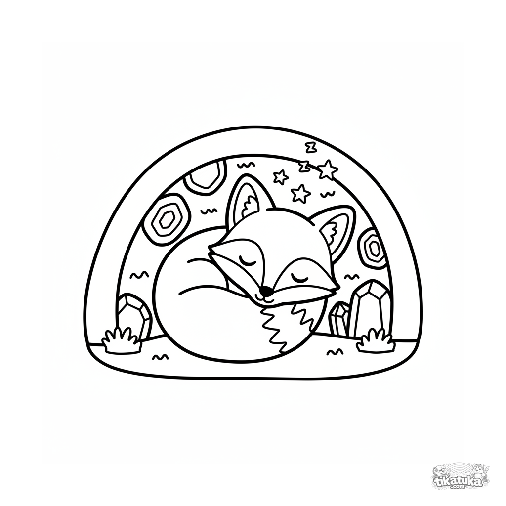 Página para colorear para niños pequeños 2-3: un cachorro de zorro de cristal duerme en una guarida. Escena de fantasía simple.