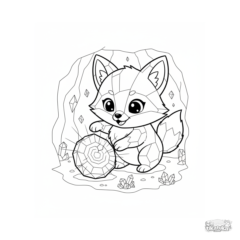 Página para colorear para preadolescentes 7-9: un cachorro de zorro de cristal juega con una geoda brillante en una cueva mágica. Estilo anime con detalles expresivos.