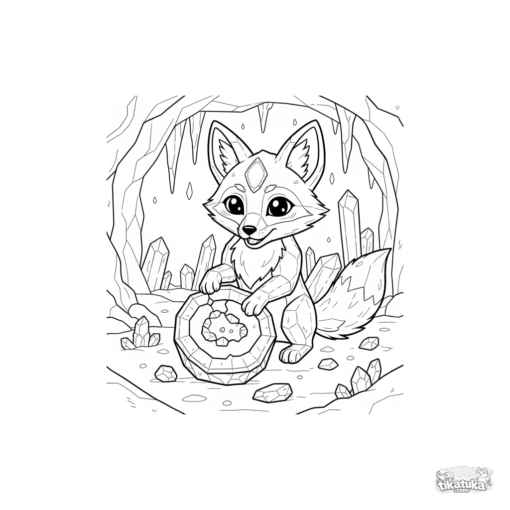 Página para colorear para niños 4-6: un cachorro de zorro de cristal juega con una geoda en una cueva brillante. Criatura de fantasía única en un entorno mágico, contornos limpios, márgenes amplios.