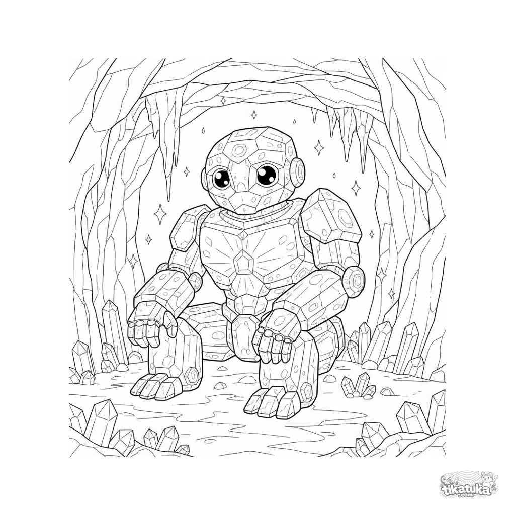 Página para colorear detallada para niños mayores 10-12: un intrincado gólem de cristal guardián se sienta en una caverna de geoda brillante. Muchas texturas.