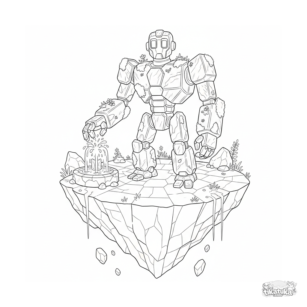 Página compleja para colorear para 10-12 años: un gólem de cristal custodia un jardín floreciente en una isla flotante. Escena detallada con textura de cristales y plantas.