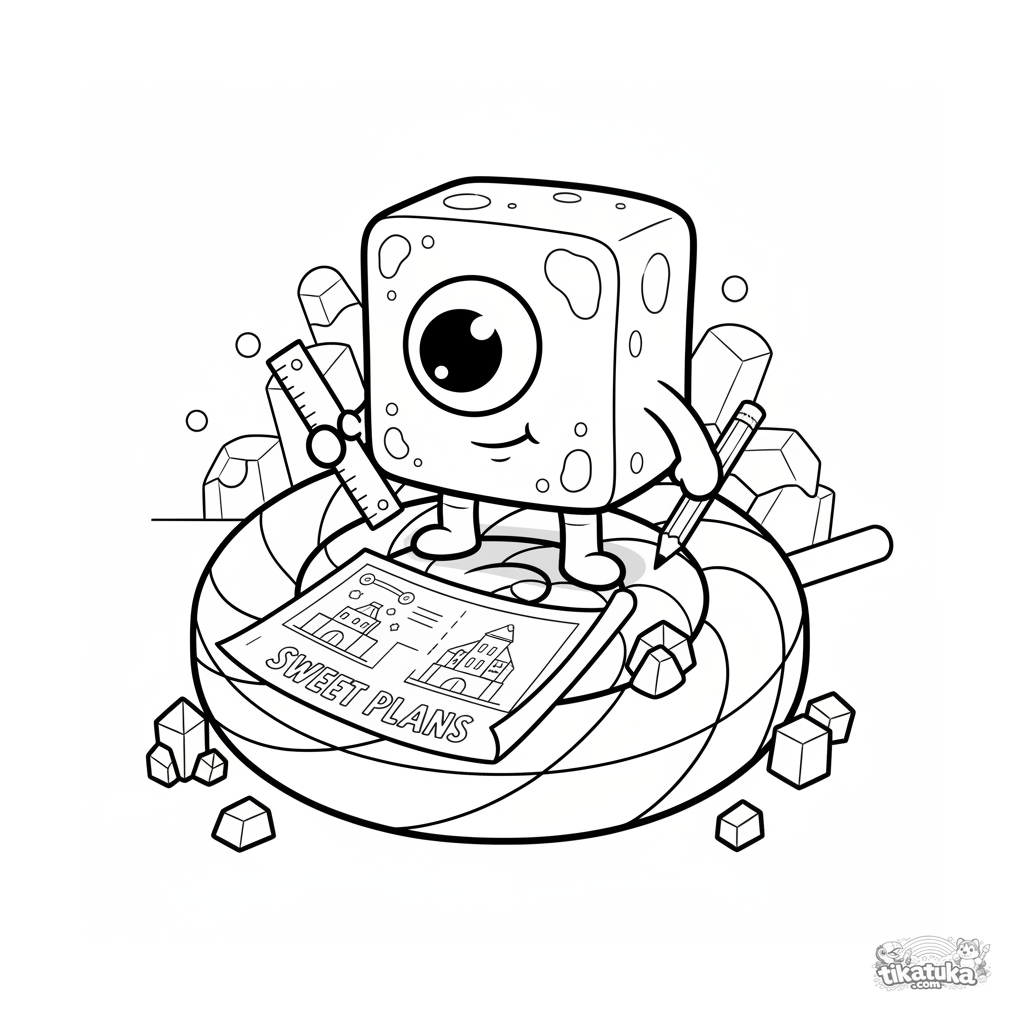 Página para colorear para niños 7-9: un microbio cubo arquitecto con un ojo ciclope estudia un plano en una piruleta gigante. Estilo de plano técnico.