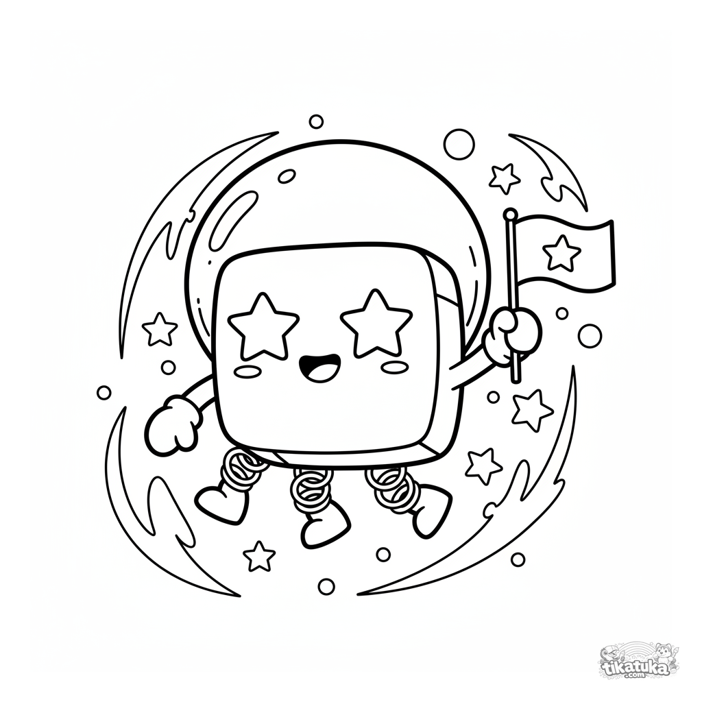 Página para colorear de un microbio cubo astronauta flotando en el espacio cómico. Para niños de 4 a 6 años. Estilo anime brillante, formas simples.
