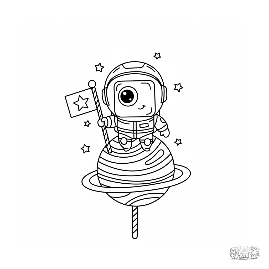 Página para colorear para niños 7-9: un microbio con forma de cubo en traje espacial explora la superficie de una piruleta como un planeta alienígena. Escena con ambiente espacial y estrellas de caramelo.