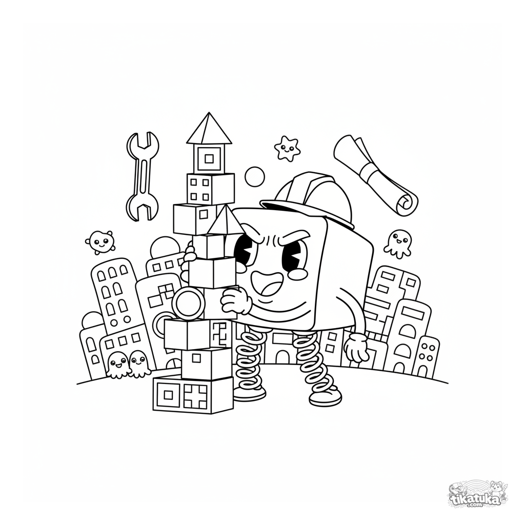 Página para colorear para niños: un microbio cúbico constructor levanta una torre en el mundo celular. Colorea el casco, las piernas de resorte y los bloques de colores.
