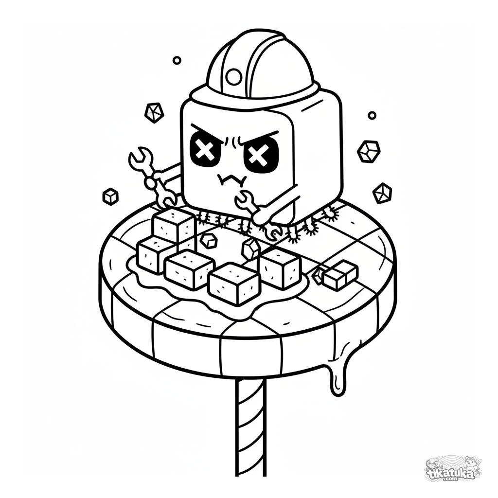 Página para colorear para 7-9 años: un microbio cubo con casco construye una casa de ladrillos de azúcar en una piruleta a cuadros. Escena geométrica.
