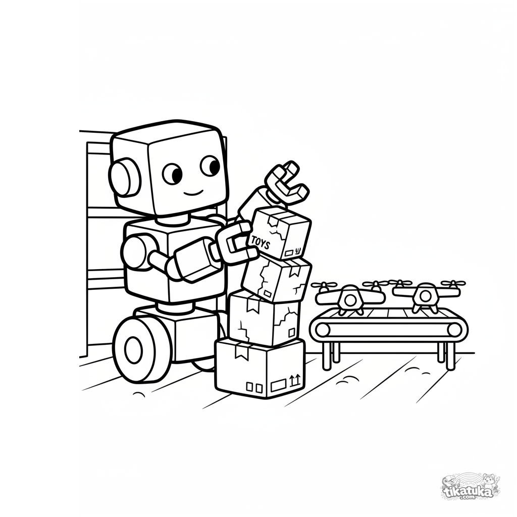 Página para colorear para niños pequeños 2-3 años: un robot cúbico simple construye una torre de cajas pequeñas en un almacén. Formas grandes, amplios márgenes.