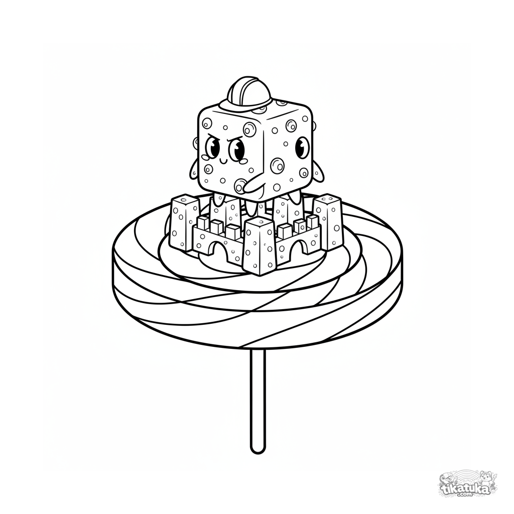 Página para colorear detallada para mayores de 10-12 años: un microbio cúbico con casco construye un castillo con ladrillos de caramelo en una piruleta gigante. Formas geométricas, detalles interesantes.