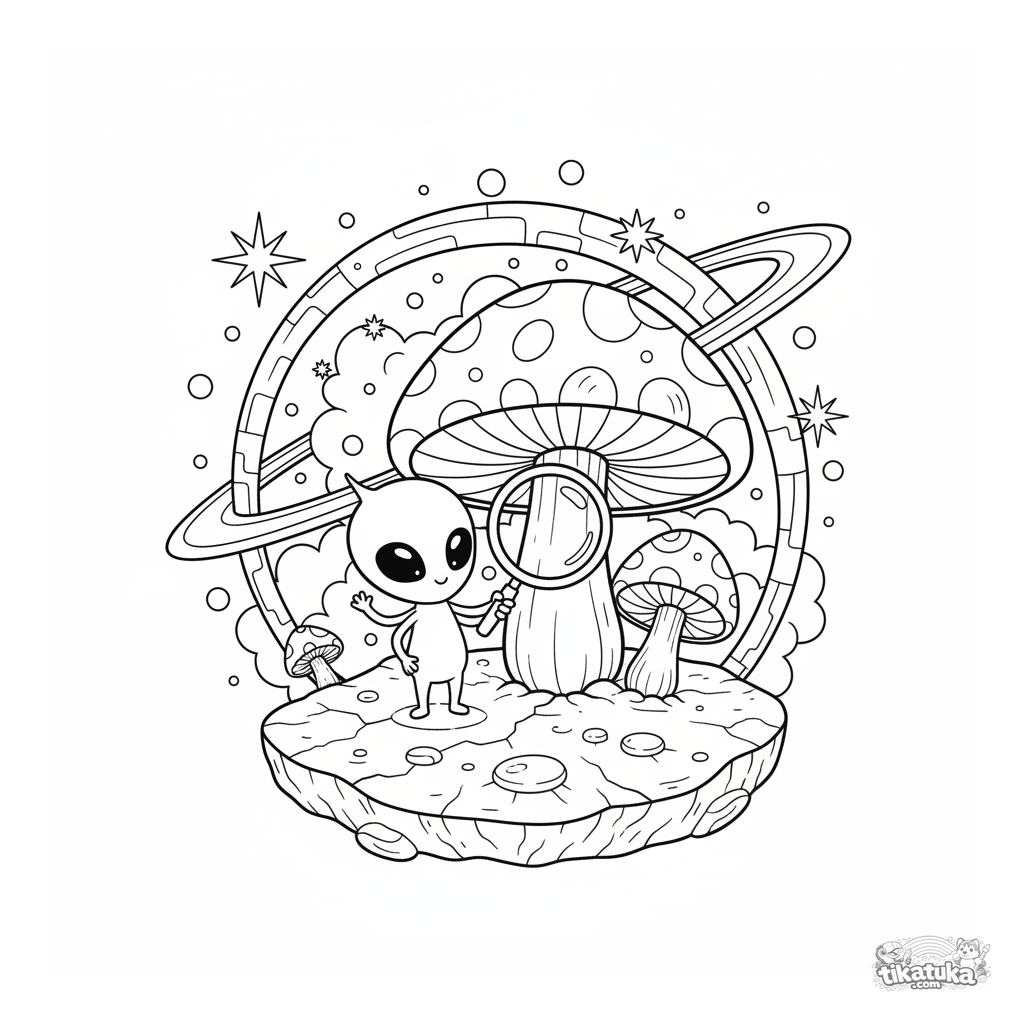 Página para colorear del espacio para niños de 4-6 años: un científico alienígena amigable con lupa estudia un hongo gigante brillante en un asteroide, con anillos planetarios en el cielo estrellado.
