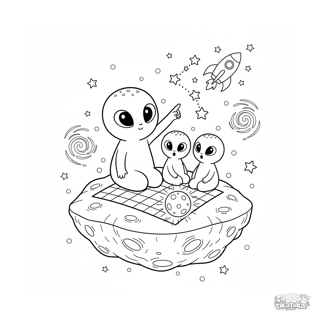 Página para colorear para 4-6 años: una linda familia alienígena sentada en un asteroide en el espacio exterior, mirando las estrellas. Formas simples y amigables.