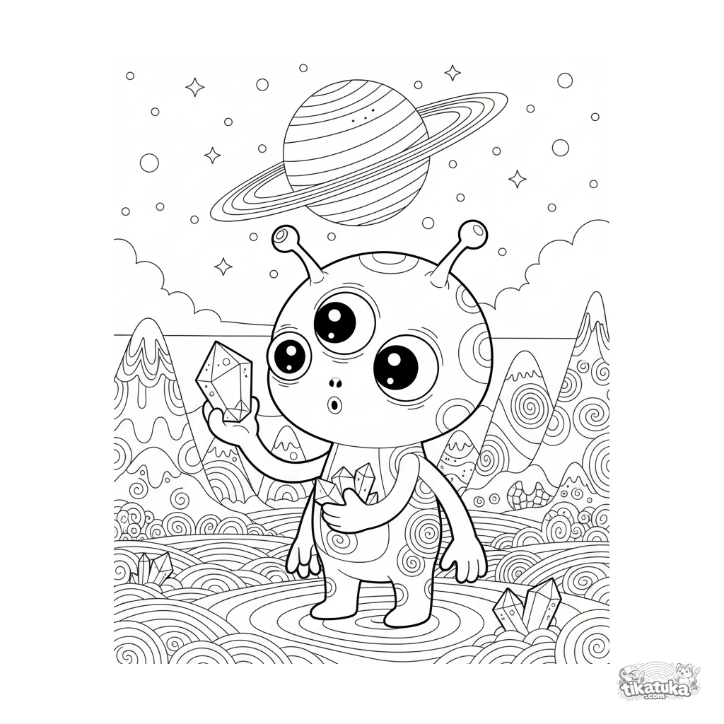 Página para colorear para niños de 7-12 años: un alienígena curioso con tres ojos recoge cristales brillantes en la superficie de un planeta arcoíris. Paisaje espacial fantástico.