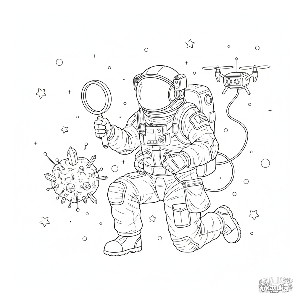 Página detallada para colorear en estilo realista de un astrogeólogo examinando un asteroide cristalino flotante en el espacio. Para niños de 8 años en adelante.