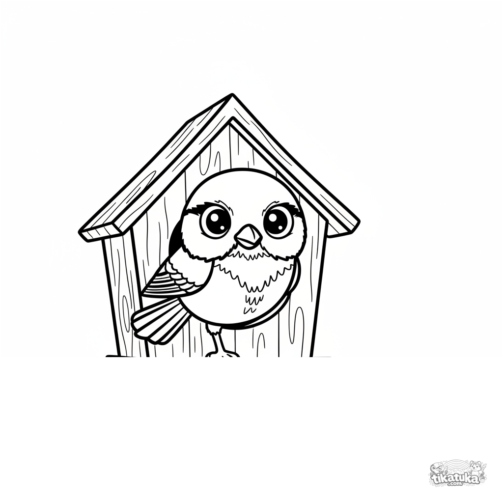 Página para colorear simple para niños pequeños 2-3: un lindo herrerillo con ojos grandes se asoma por el agujero redondo de una casa de pájaros de madera. Formas grandes y claras.
