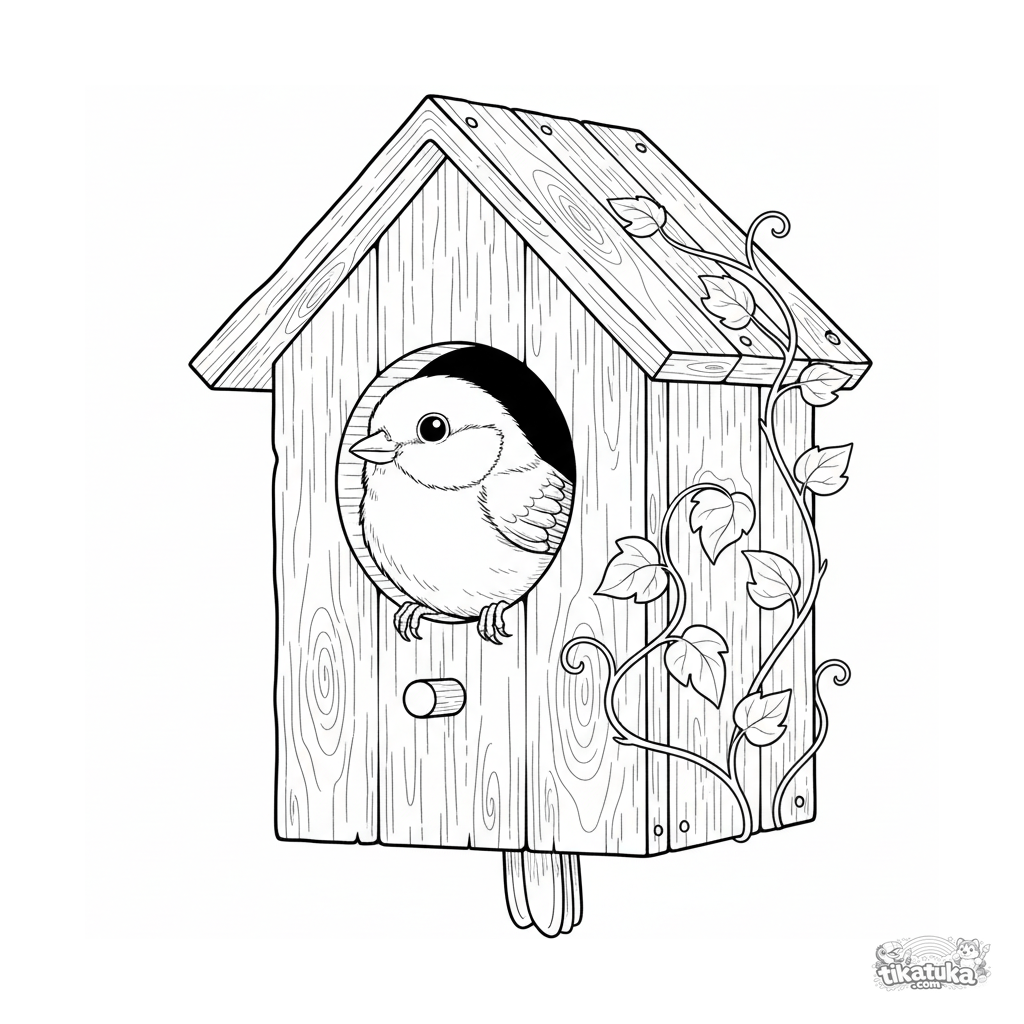 Página para colorear detallada para 10-12 años: un herrerillo común con plumaje brillante se asoma por la ventana redonda de una casa de pájaros de madera. Estilo realista de guía de campo.