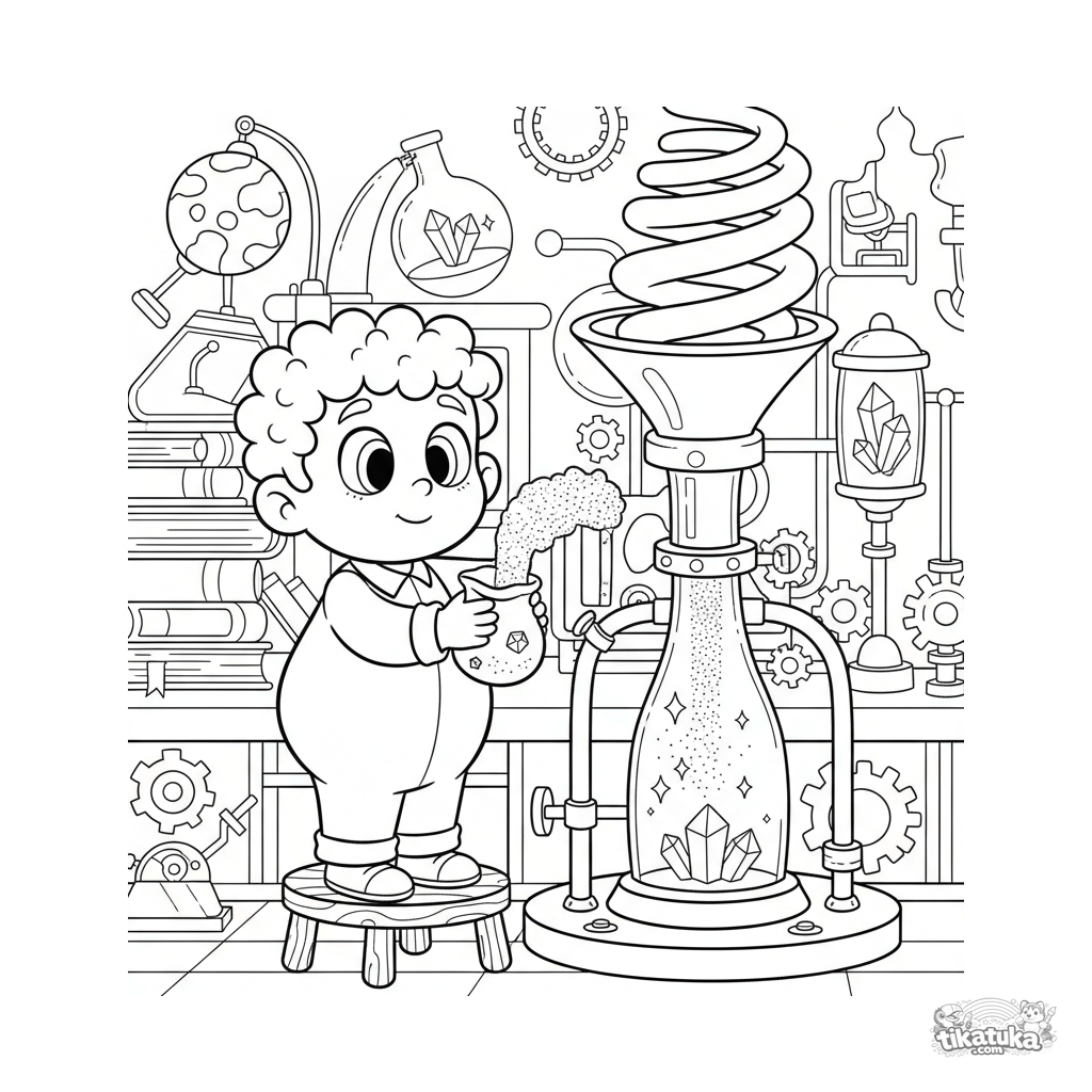 Página para colorear para niños 4-6: un niño en un laboratorio secreto vierte polvo brillante en una máquina de hacer cristales. Tubos de vidrio, bobinas de cobre, taburete.