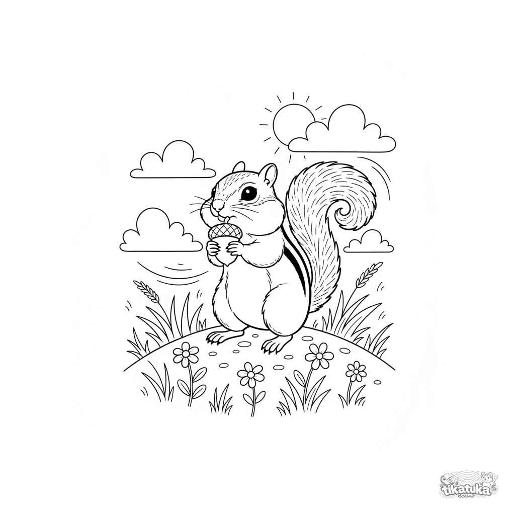 Página para colorear de una ardilla listada curiosa en una colina ventosa. Para niños de 4 a 6 años. Imagen en estilo realista con detalles de la naturaleza.