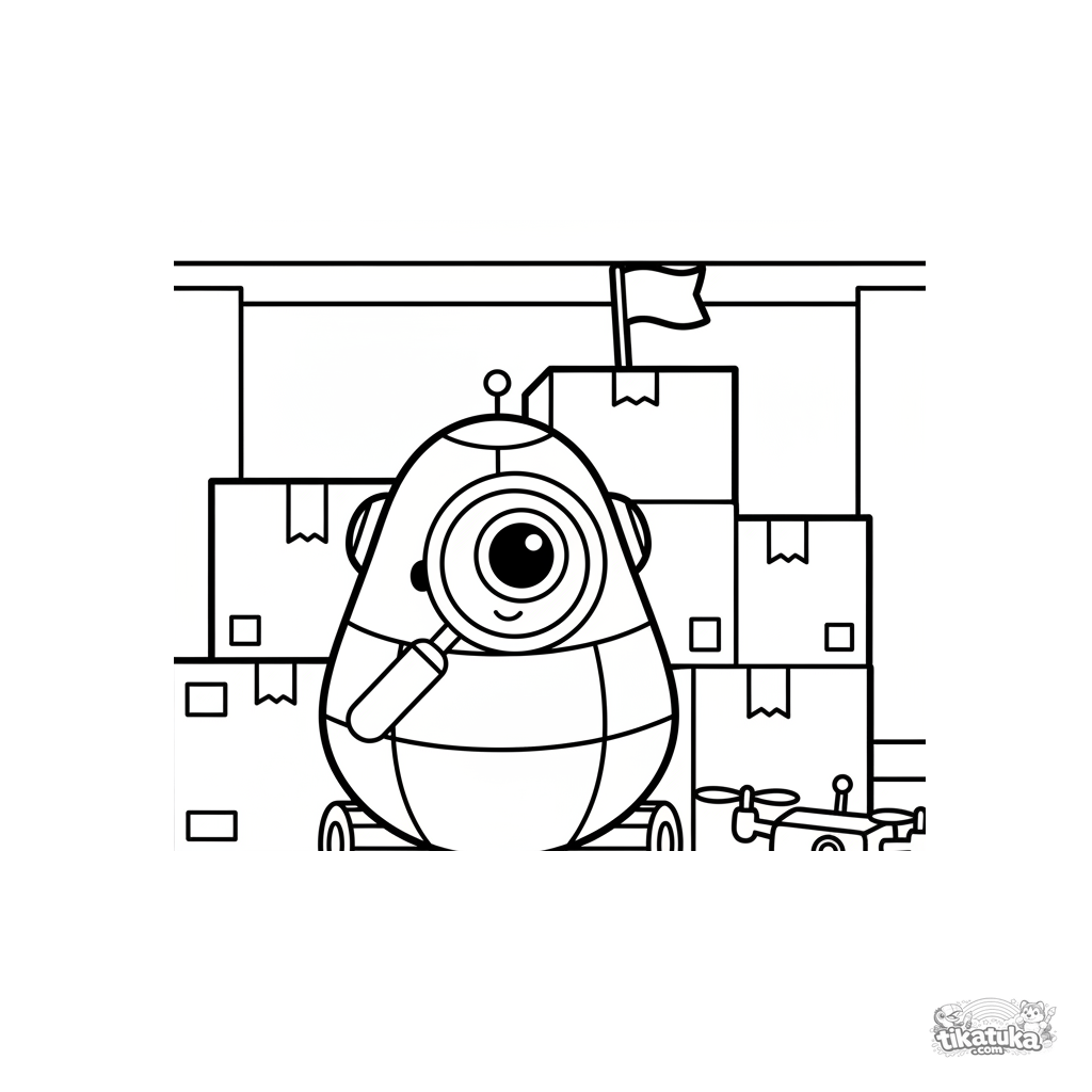 Página para colorear para niños de 2-3 años: un pequeño robot con forma de pera asoma desde detrás de una pared de cajas que construyó como fuerte en el almacén. Formas simples y suaves, márgenes amplios.